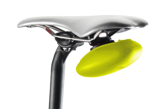 Die zum größten Teil neongelbe Satteltasche besteht aus Kunststoff, dass mit Gummi bedeckt ist.
